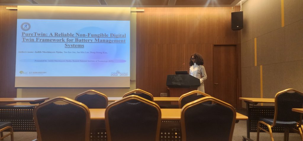 3. Judith Nkechinyere Njoku, Tae-Soo Joon, Jae-Min Lee, Dong-Seong Kim, “PureTwin: A Reliable Non-Fungible Digital Twin Framework for Battery Management Systems“, The 35th Joint Conference on Communication and Information (JCCI 2025), Sokcho South Korea. Paper URL