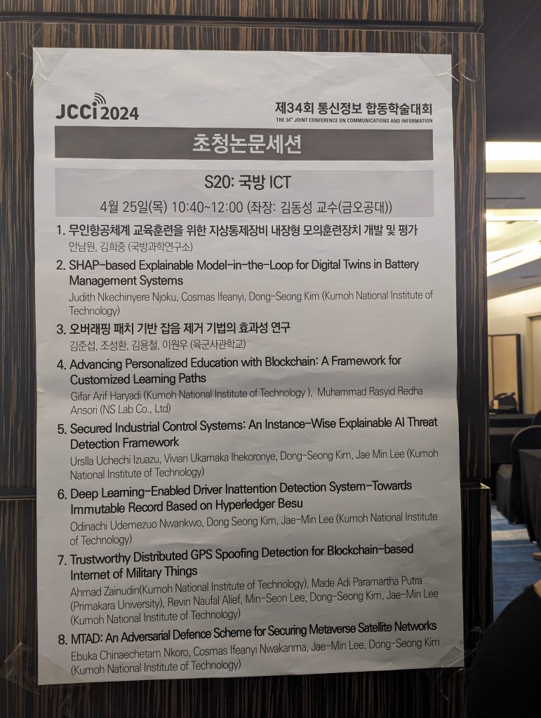 - Nkoro Ebuka Chinaechetam, Judith Nkechinyere Njoku, Cosmas Ifeanyi Nwakanma, Jae Min Lee, Dong-Seong Kim, “Cyber-chameleon: A moving target defence mechanism for metaverse cyberattacks”, Korean Institute of Communications and Information Sciences (KICS Fall 2023), Jeju Island, South Korea, Paper URL